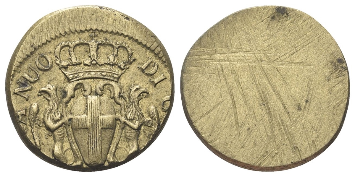 Dr. Albero di rovere in scudo decagono a lati curvilinei coronato entro doppia cornice quadrilobata. Rv. S. Giovanni evangelista a s. e S. Giacomo a d. stanti in atto di conversare.