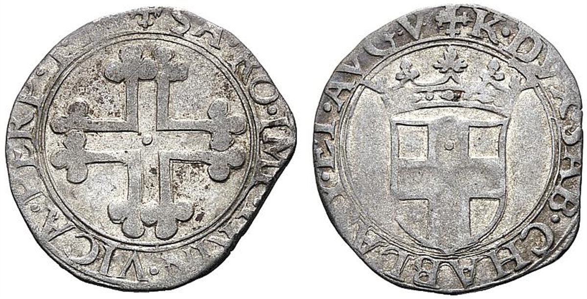 Dr. SA RO IMP PRINC VICA PERP T…Quattro mezze croci mauriziane disposte in modo da formare una doppia. Rv. K DVX SAB CHABLASY ET AVG V Scudo sabaudo, con corona di 5 fioroni.
