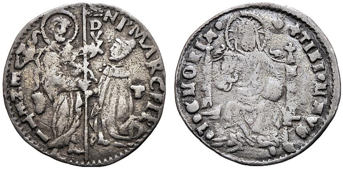 Dr. San Marco porge il vessillo al Doge stante di fronte, tra i due in verticale DVX. Rv. Il Redentore seduto su trono.