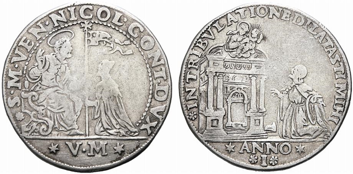 Dr. S. Marco in trono scolpito, bendice con la d. sollevata, mentre porge con la s. il vessillo al doge genuflesso che lo riceve con la s., mentre si porta la d. al petto; all'esergo, V M (Urbano Malipiero). Rv. IN TRIBVLATIONE DILATASTI MIHI Il Doge, a capo scoperto ed a braccia aperte, è genuflesso dinanzi al portale di una chiesa; all'esergo, ANNO I.