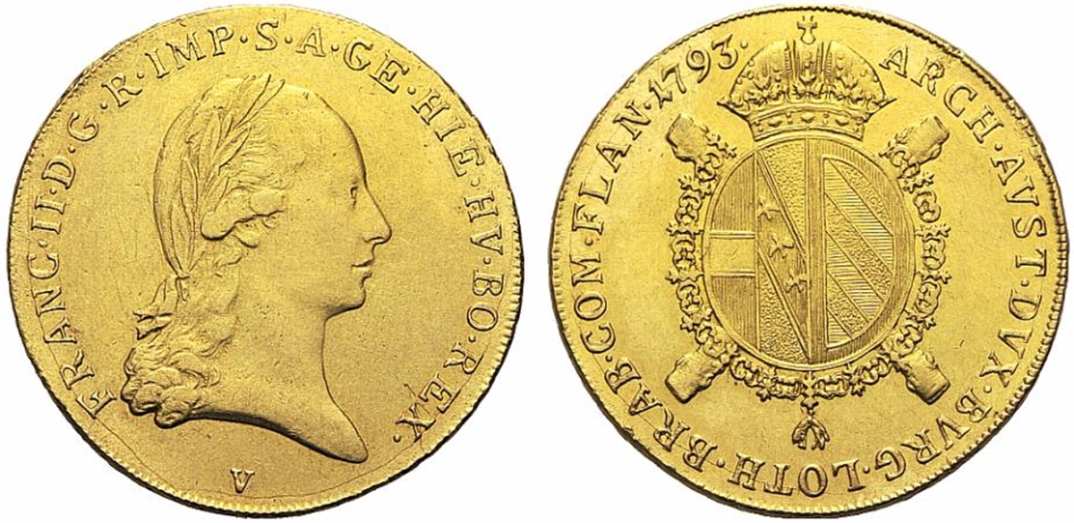 Un’ordinanza imperiale del 22 Novembre 1823, dispose la battitura del Sovrano e del Mezzo Sovrano di Fiandra, con la data 1793, in varie zecche dell’impero. Anche a Milano ed a Venezia ne furono battuti un certo numero imprecisato di esemplari. Un esemplare, del Sovrano di Fiandra per Venezia, fu offerto, nel 1834, dall’arciduca Ranieri al Museo di Vienna come risulta da una nota manoscritta sulla stessa moneta (dal Paolucci).