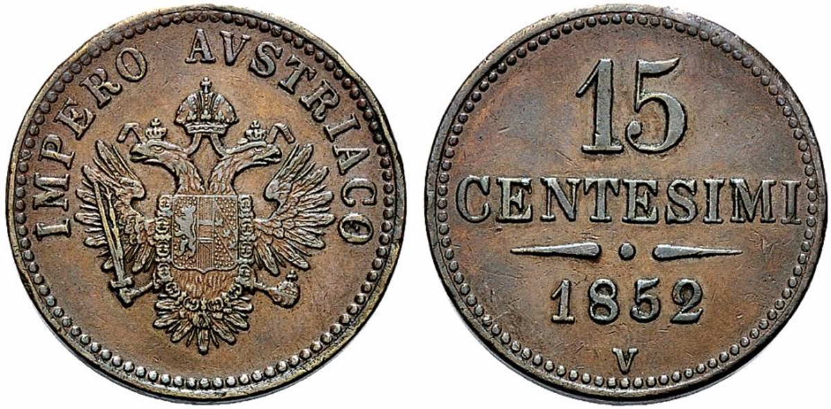 Francesco Giuseppe I d’Asburgo Lorena, 1848-1866. 15 Centesimi 1852.