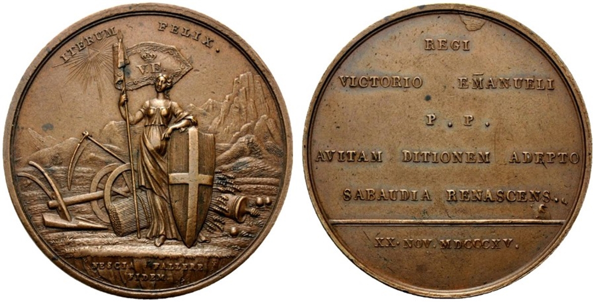 Dr. Nel campo figura femminile stante appoggiata su scudo: con la d. regge la bandiera con VE attorniata da attributi dell’agricoltura e della guerra; sullo sfondo, montagne. Rv. Legenda su sei righe, di cui una in esergo.