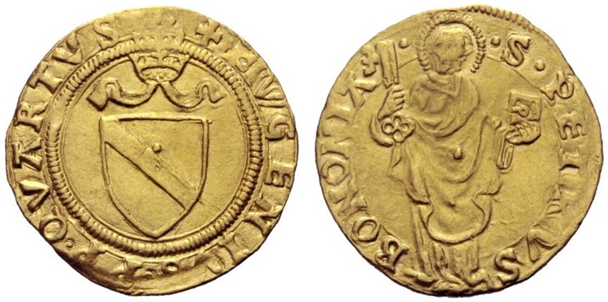 Dr. EVGENIVS PP QVARTVS Stemma sormontato da triregno e chiavi decussate. Rv. S PETRVS BONONIA S. Pietro, nimbato, stante e frontale.