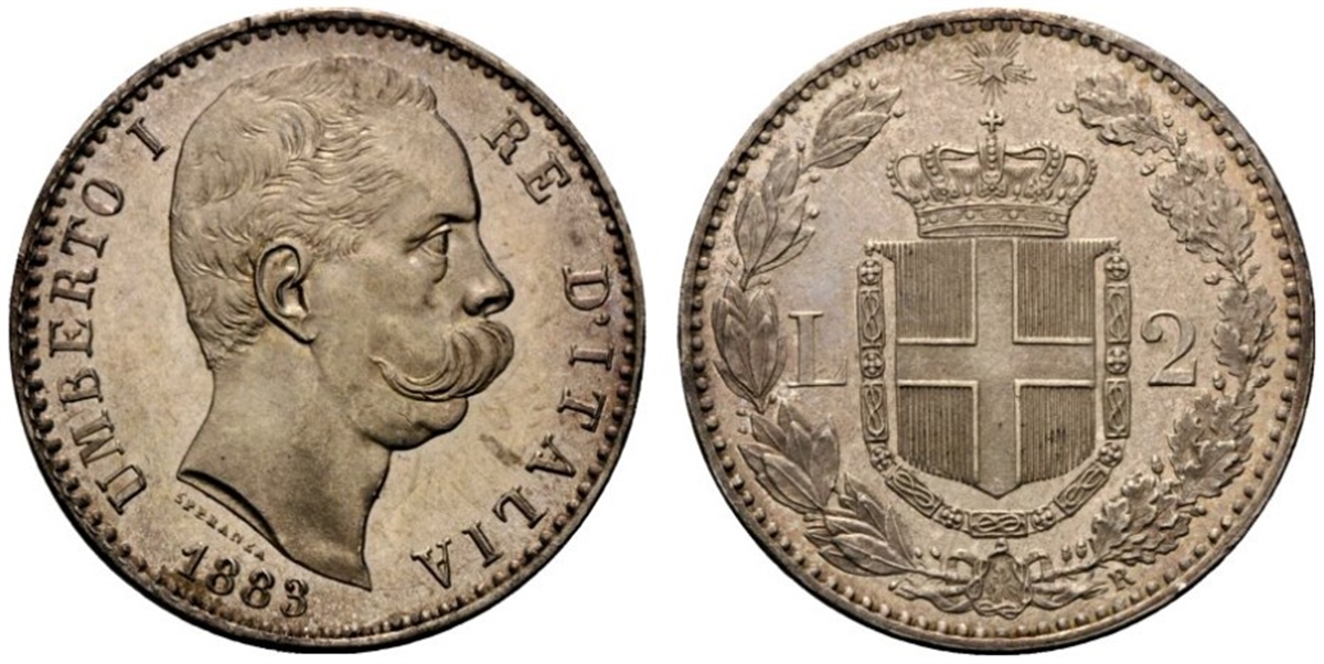 Umberto I, 1878-1900. 2 Lire 1883 Roma, I° Tipo.