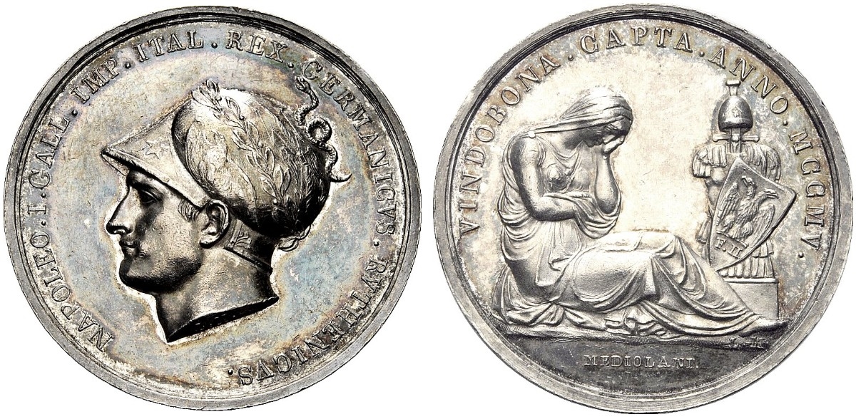 Dr. NAPOLEO I GALE IMP ITAL REX GERMANICVS RVTHENICVS Napoleone con elmo di Atena di profilo a s. Rv. VINDOBONA CAPTA ANNO MCCMV Personificazione seduta dell’Austria rivolta verso un trofeo militare dove è presente sullo scudo l’aquila bicipide e le cifre F II.