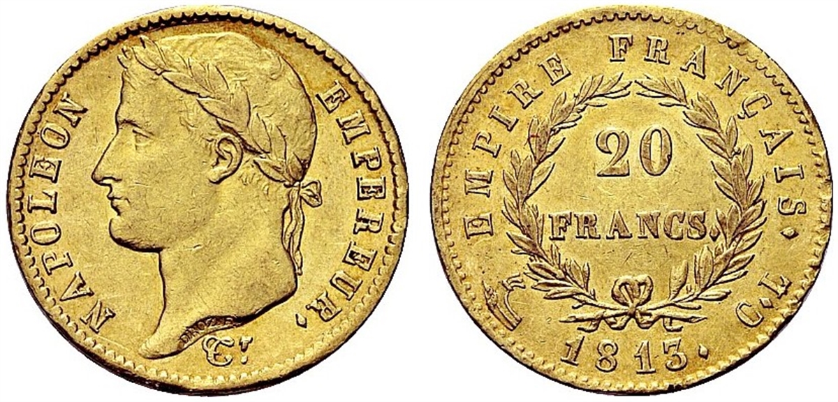 Napoleone I Imperatore, 1804-1814 e 1815. 20 Franchi 1813 Genova.