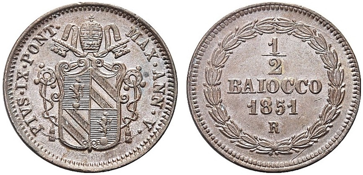 ROMA - Pio IX (Giovanni Maria Mastai Ferretti), 1846-1878. - Mezzo baiocco 1851 a. V.