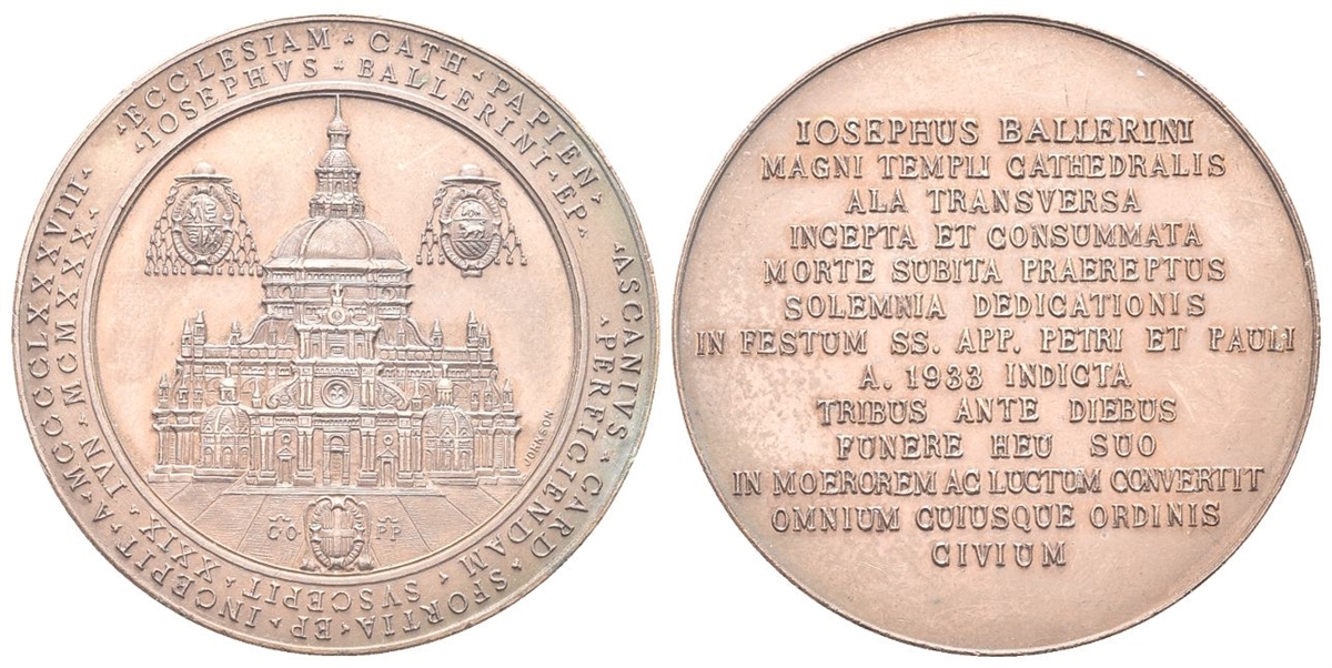 Dr. ECCLESIAM CATH PAPIEN / IOSEPHVS BALLERINI EP. Prospetto anteriore del Duomo di Pavia tra stemmi vescovile e cardinalizio sormontati da galeri; sotto, ASCANIVS CARD SFORTIA EP INCEPIT MCCCCLXXXVIII / PERFICIENDAM SVSCEPIT XXIX IVN MCMXXX. Rv. IOSEPHUS BALLERINI / MAGNI TEMPLI CATHEDRALIS / ALA TRAVERSA / INCEPTA ET CONSUMMATA / MORTE SUBITA PRAEREPTUS / SOLEMNIA DEDICATIONIS / IN FESTUM SS. APP PETRI ET PAULI / A. 1933 INDICTA / TRIBUS ANTE DIEBUS / FODERE HEU SUO / IN MOEROREM AC LUCTUM C