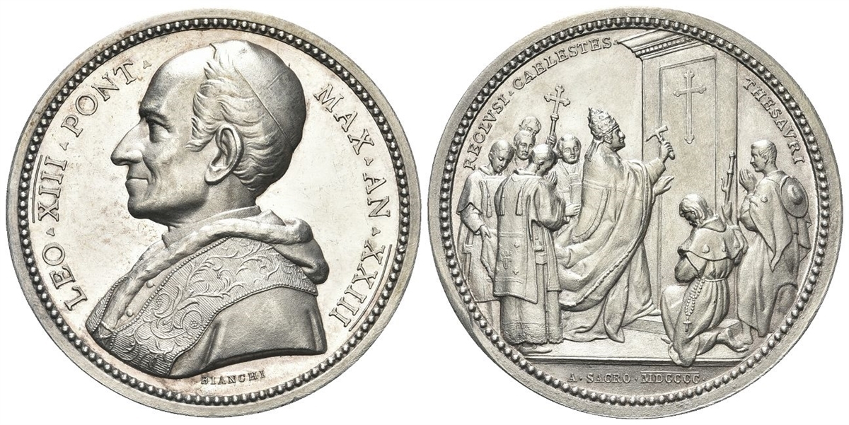 Dr. LEO XIII PONT - MAX AN XXIII. Busto a s. con berretto, mozzetta e stola; sotto, BIANCHI. Rv. RECLVSI CAELESTES - THESAVRI. Il Pontefice in atto di aprire la Porta Santa, circondato da cardinali e pellegrini; in esergo, A SACRO MDCCCC.