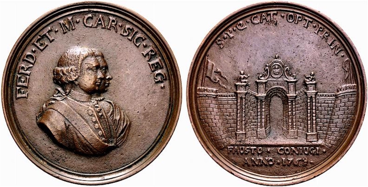 Dr. FERD ET M CAR SIC REG Effige del Re e della Regina accollati a d. Rv. S P Q CAT OPT PRIN Porta della città di Catania fiancheggiata da bastioni con bandiere in cima; all’esergo FAVSTO CONIVGI/ANNO 1768.