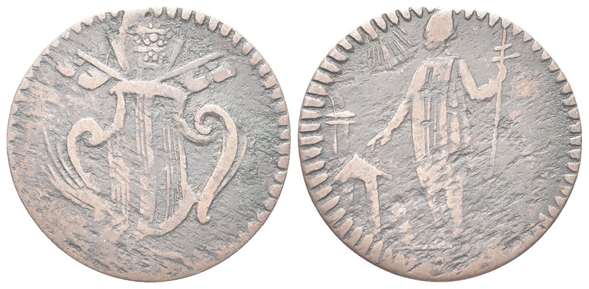 Dr. Anepigrafe. Stemma tra volute regolari, sormontato da triregno e chiavi decussate. Rv. Anepigrafe. Santo Apollinare stante verso s., con la d.benedice un edificio, con la s.regge una croce; davanti al viso, raggi pioventi.