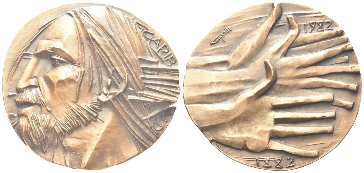 Dr. G GARIB - ALDI. Testa a s. Rv. Tre mani protese verso d.; sopra, GRILLI - 1982; sotto, 1882.