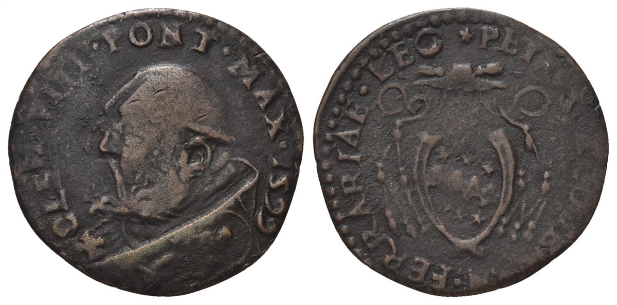 Dr. CLEM VIII PONT MAX 1599. Busto a s., con piviale decorato. Rv. PETRVS ALDOBRAN FERRARIAE LEG. Stemma ovale in cornice sormontato da galero.