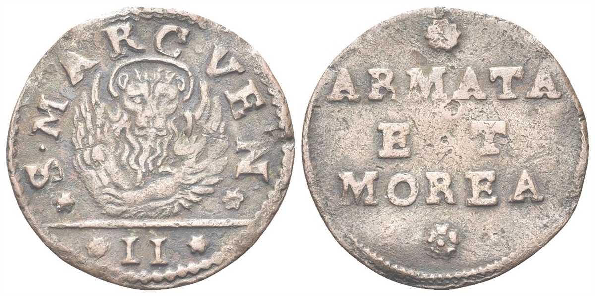 Dr. S MARC VEN. Leone di San Marco con Vangelo; in esergo, II tra due rosette. Rv. ARMATA / ET / MOREA. Iscrizione disposta su tre righe.