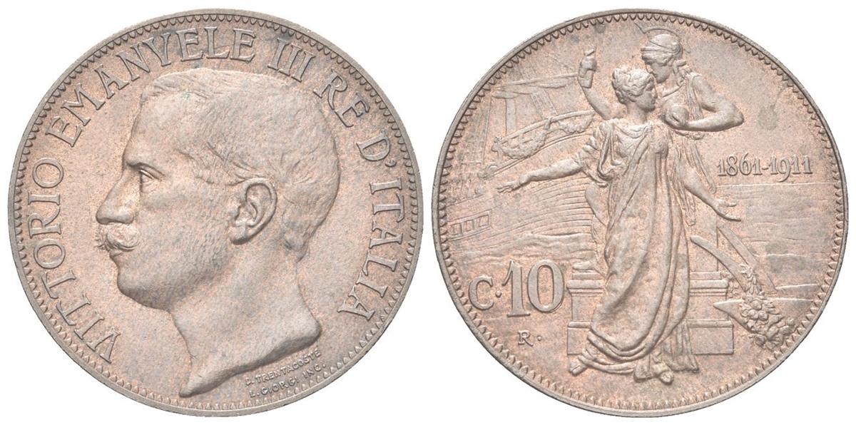 Vittorio Emanuele III, 1900-1943. 10 Centesimi 1911 Roma, Cinquantenario.