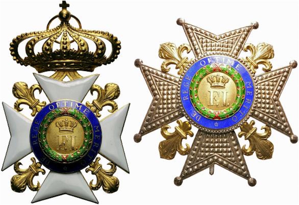 Ordine di Francesco I. Placca e pendente di gran croce completo in Ar dorato e smalti, compreso di fascia con nastro e mignon da abito da sera. Placca in Ar. Il Pendente è formato da una croce biforcata, smaltata di bianco e accantonata da quattro gigli d