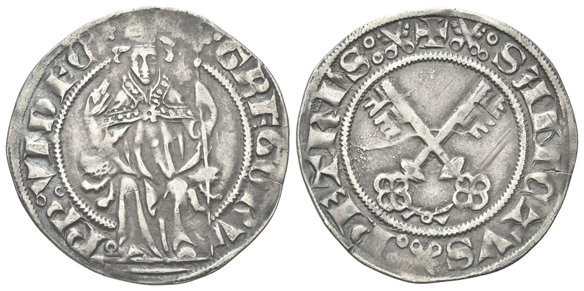 Dr. GREGORV - PP VNDEC. Il Papa seduto in trono di fronte. Rv. SANCTVS - PETRVS. Chiave decussate.