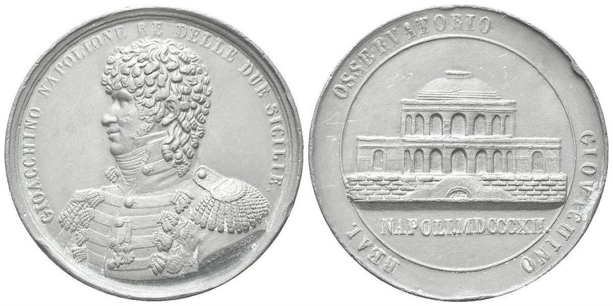 Dr. GIOACCHINO NAPOLEONE RE DELLE DUE SICILIE. Busto a s., in alta uniforme; nel taglio del braccio, JALEY FECIT / ANNO MDCCCXI. Rv. REAL OSSERVATORIO GIOVACHINO. Prospetto del nuovo edificio; in esergo, NAPOLI MDCCCXII.
