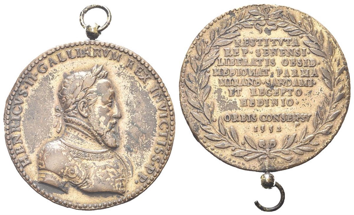 Dr. ENRICVS II GALLIARVM REX INVICTISS PP. Busto laureato a d., con armatura finemente decorata e collare dell’ordine di San Michele. Rv. RESTITVTA REP SENENSI / LIBERATIS OBSID / MEDIOMAT PARMA / MIRAND SANDAMI / ET RECEPTO / HEDINIO / ORBIS CONSENSV / 1552. Iscrizione disposta su nove righe entro corona d’alloro.