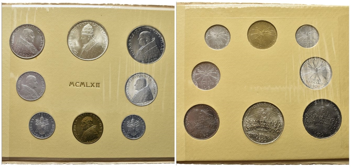 Giovanni XXIII (Angelo Giuseppe Roncalli), 1958-1963. Serie completa di 8 valori 1962 a. IV Concilio Ecumenico. Da 500 lire (Ag), 100 e 50 lire (Ac), 20 (Ba) 10, 5, 2 e lira (It).