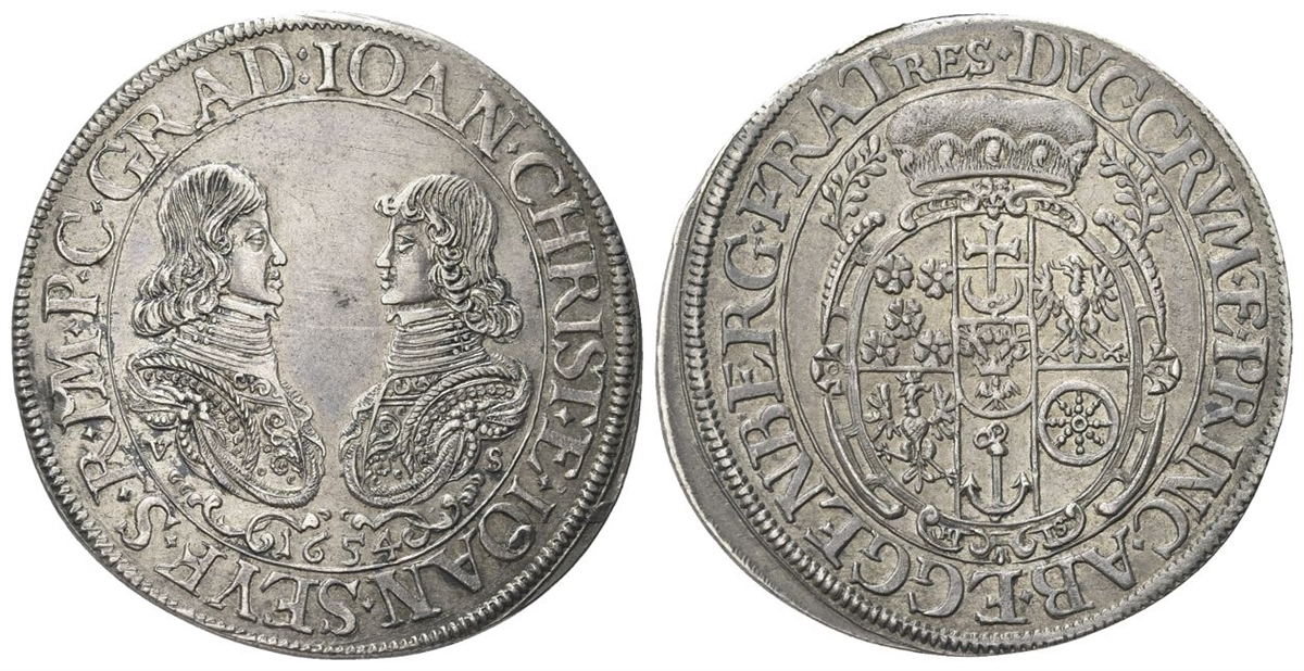 Dr. IOAN CHRIST E IOAN SEVF S R IMP PR GRADIS. Busti affrontati e corazzati; sotto, 1654 entro ornati. Rv. EGGENBERG FRATRES DVC CRVM ET PRINC AB. Stemma inquartato e coronato, tra rami di alloro.