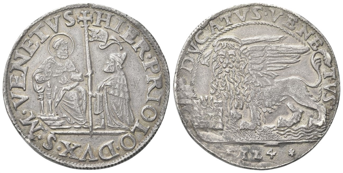 Dr. HIER PRIOLO DVX S M VENETVS. San Marco, in trono verso d., porge il vessillo al Doge genuflesso; sulla banderuola, leone gradiente verso s. Rv. DVCATVS VENE - TVS. Leone, alato e nimbato, gradiente verso s., poggia la zampa sul libro aperto; a s., monte sormontato da castello; in esergo, tre rosette.