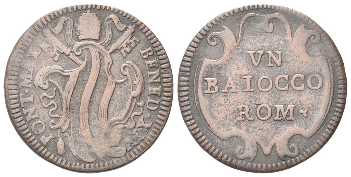 Dr. BENEDICT - XIV P M. Stemma sormontato da triregno e chiavi decussate. Rv. UN / BAIOCCO / ROM. Iscrizione entro cartella.