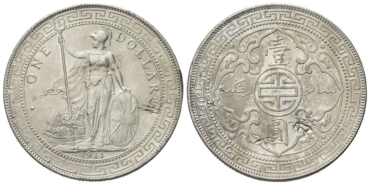 Edoardo VII, 1901-1910. Trade Dollar 1911 con contromarca al dr. e al rv.