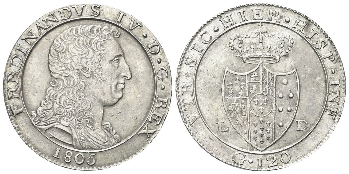 Ferdinando IV (I) di Borbone, 1759-1816. Piastra da 120 Grana 1805, capelli ricci.