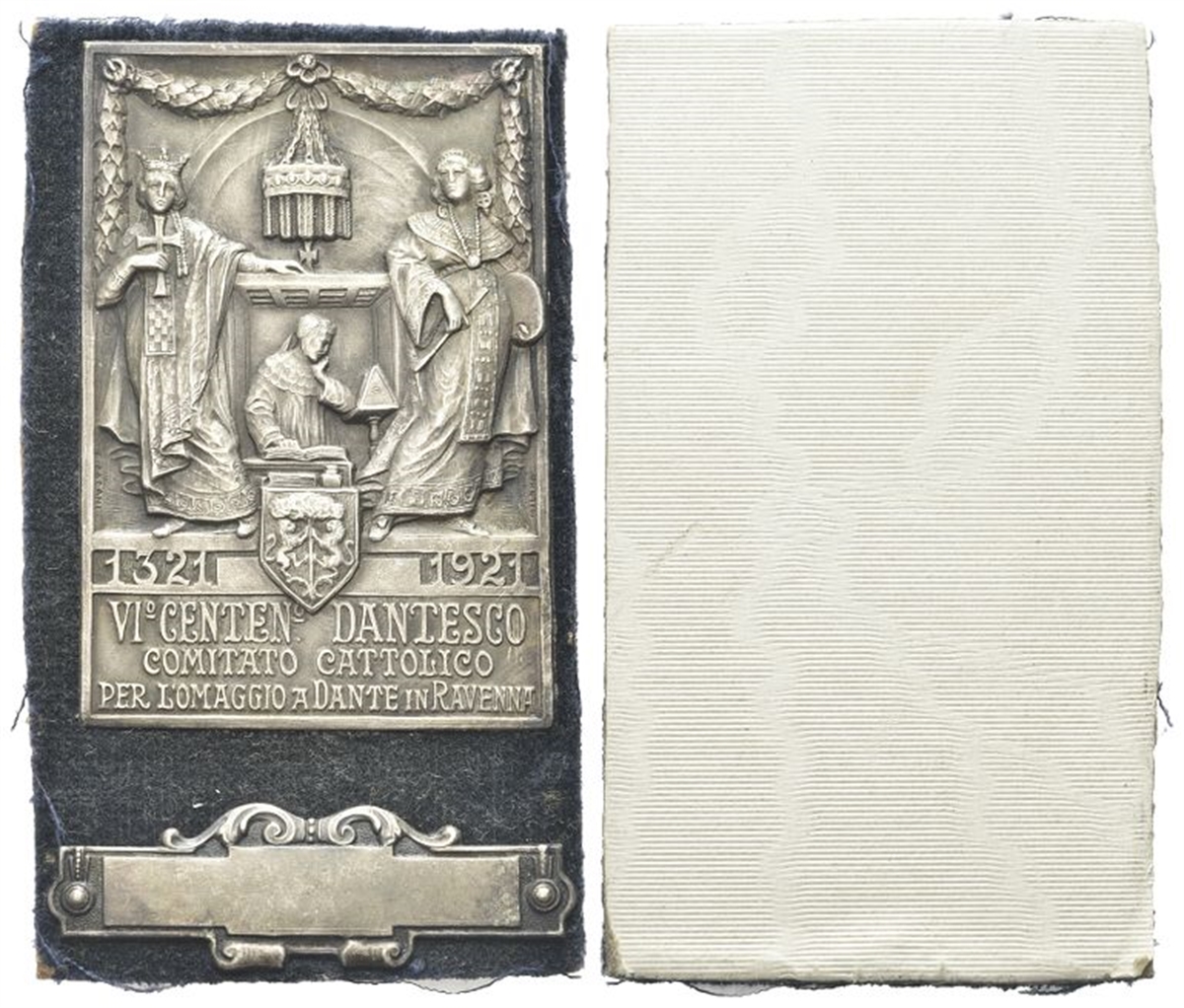 Dr. Busto di Dante Alighieri davanti al leggio entro il suo studio; ai lati allegorie della Religione Cattolica e del Pensiero Laico; sotto, 1321 (stemma della città) 1921; in esergo, VI° CENTEN DANTESCO / COMITATO CATTOLICO / PER L'OMAGGIO A DANTE IN RAV