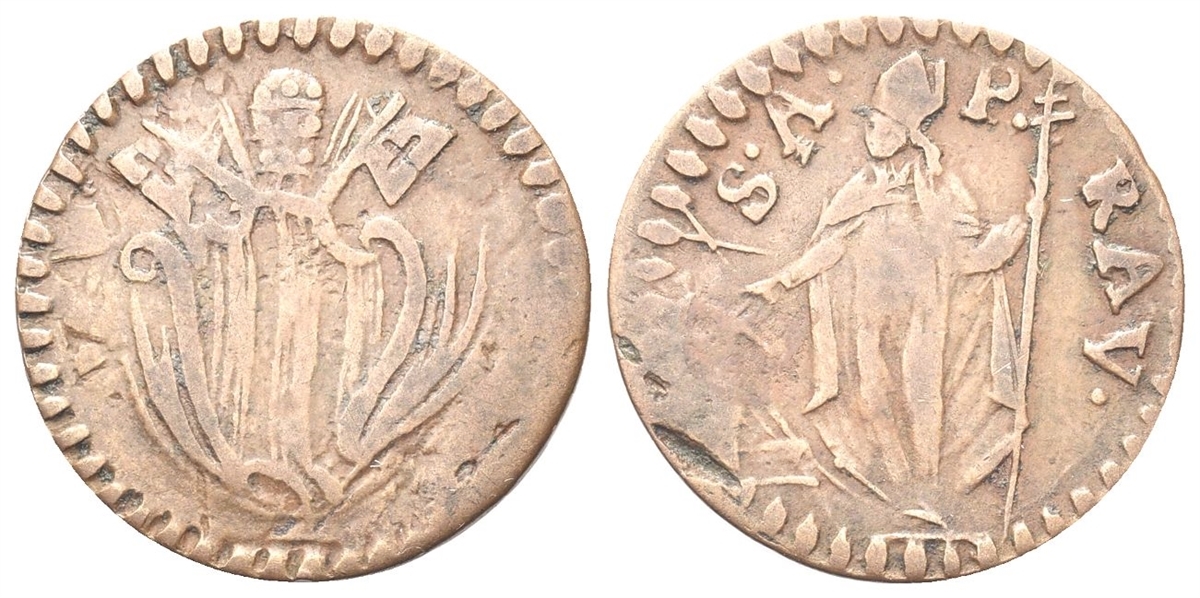 Dr. Stemma semiovale sormontato da chiavi decussate e tiara. Rv. S A - P - RAV. Santo Apollinare stante verso s., tiene croce potenziata.
