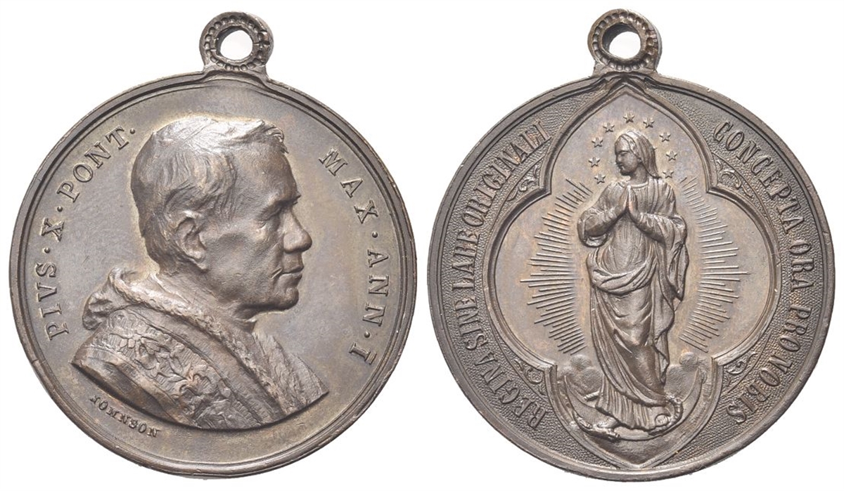Dr. PIVS X PONT - MAX ANN I. Busto del Pontefice a d. con berretto, mozzetta e stola. Rv. REGINA SINE LABE ORIGINALI - CONCEPTA ORA PRO NOBIS. La Beata Vergine raggiante su nubi.