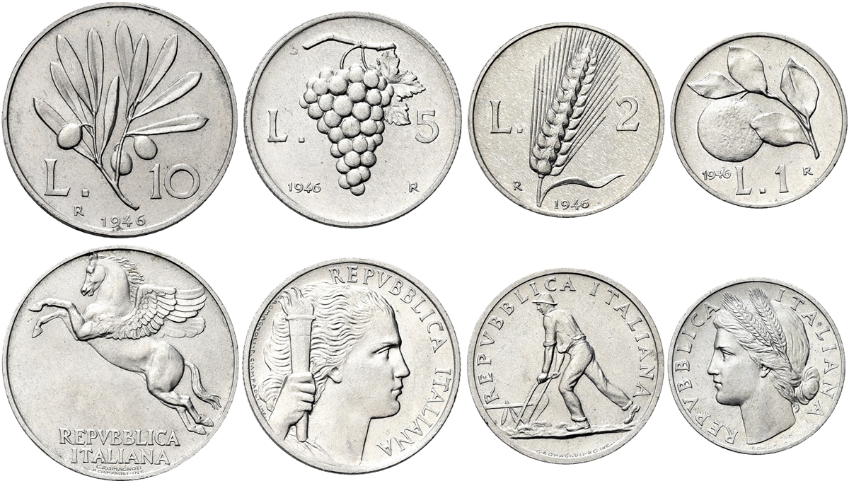 Repubblica Italiana, dal 1946. Serie 1946 comprendente 10 Lire, 5 Lire, 2 Lire e Lira.