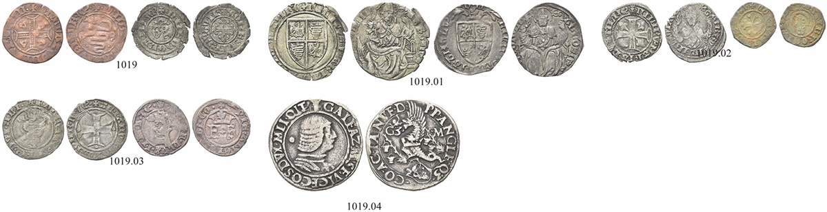 Lotto di 9 monete milanesi: si segnalano due pegioni e un testone di Gian Galeazzo Sforza.