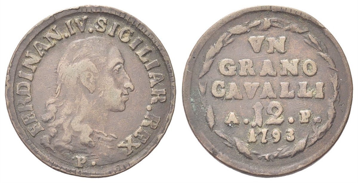 Dr. FERDINAN IV SICILIAR REX. Busto corazzato a d., con capelli fluenti. Rv. VN / GRANO / CAVALLI / A 12 P / 1793. Iscrizione disposta su cinque righe entro corona.