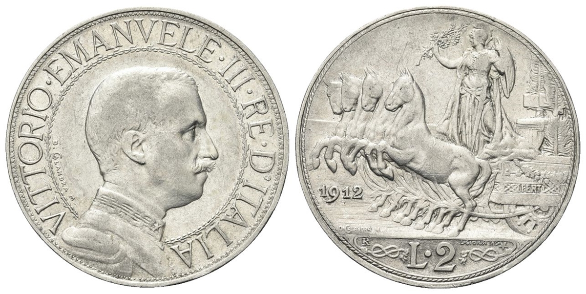 Vittorio Emanuele III, 1900-1943. 2 Lire 1912 Roma, Quadriga veloce.