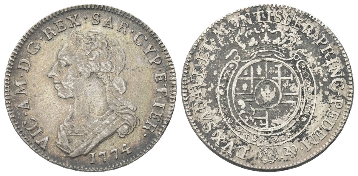 Dr. VIC AM D G REX SAR CYP ET IER. Busto a d.; sotto, 1774. Rv. DVX SABAVD ET MONTISFER PRINC PEDEM &. Aquila coronata con scudo savoia caricato al petto.