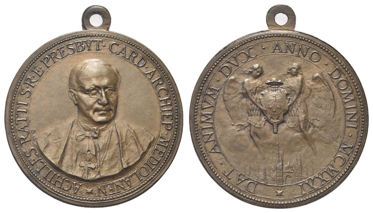 Dr. CARD ARCHIEP MEDIOLNEN ACHILLES RATTI S R E PRESBYT. Busto, di scorcio, verso s., con berretto, veste talare e Croce pettorale. Rv. DAT ANIMVM DVX ANNO DOMINI MCMXXI. Stemma sormontato da cappello tra due angeli; sotto, veduta del Duomo.