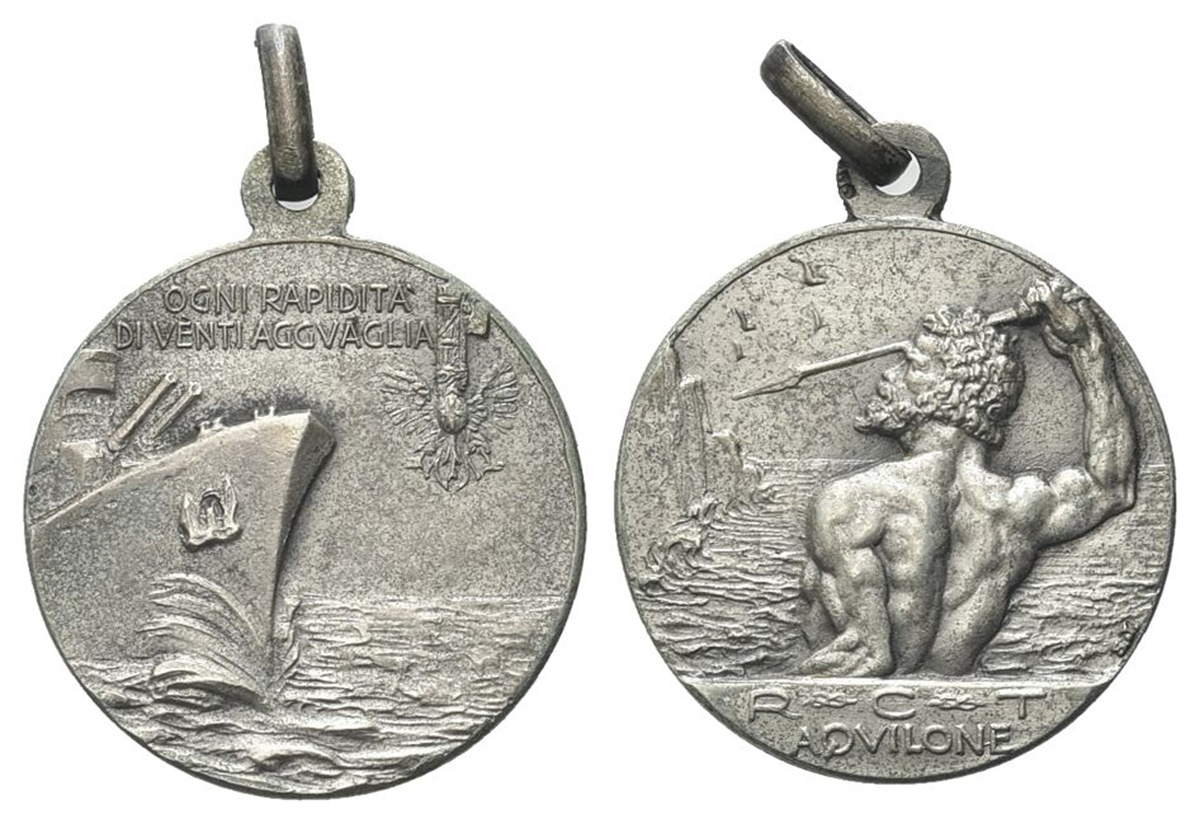 Dr. OGNI RAPIDITà / DI VENTI AGGVAGLIA. Nave in mare verso d.; a d., Fascio con scure che termina in corpo d’aquila con stemma savoia in petto. Rv. Nettuno con tridente; a s., S J; in esergo, R C T / AQVILONE.