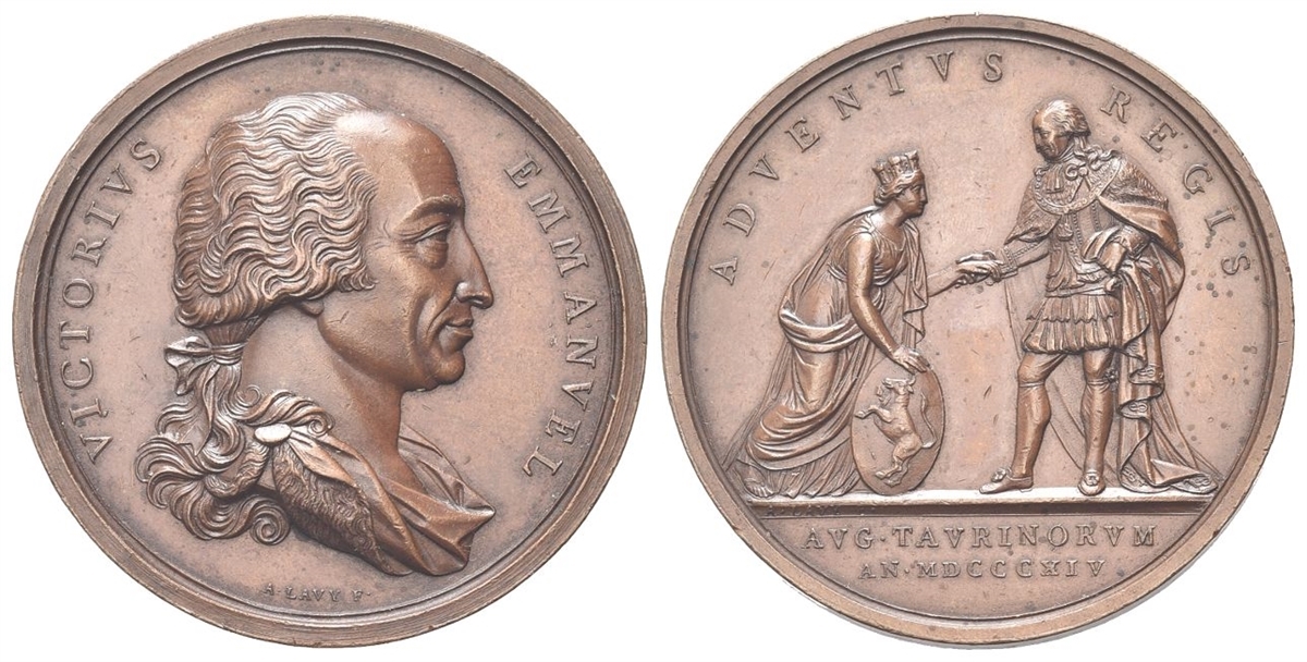 Dr. VICTORIVS - EMMANVEL. Busto del re a d.; in esergo, A LAVY F. Rv. ADVENTVS - REGIS. Torino accoglie deferente il suo re; in esergo, AVG.TAVRINORVM / AN MDCCCXIV.