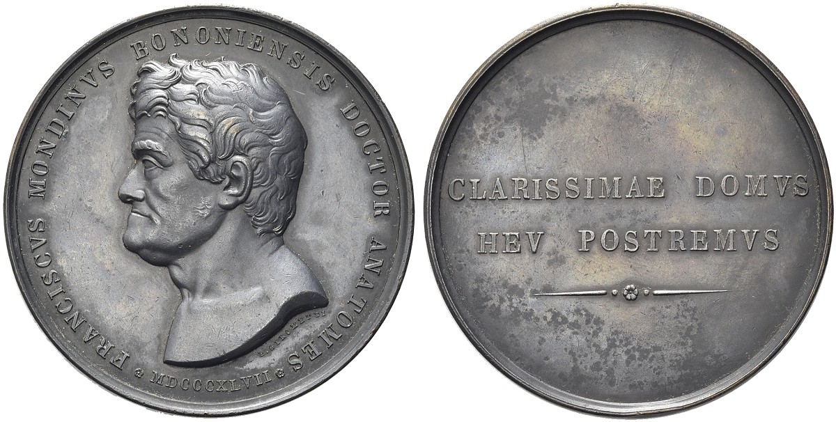 Dr. FRANCISCVS MONDINVS BONONIENSIS DOCTOR ANATOMESE. Busto a s.; sotto, F GIROMETTI / MDCCCXLVII. Rv. CLARISSIMAE DOMVS / HEV POSTREMVS. Iscrizione disposta su due righe.