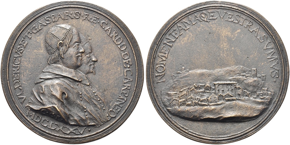 Dr. VLDERICVS ET GASPAR S R E CARDD OE CARPINEO. Busti accollati a d. con zucchetto e mozzetta; sulla troncatura del braccio, C C F; sotto, MDCLXXV. Rv. NOMEN FAMA QE VESTRA SVMVS. Veduta di Carpegna.