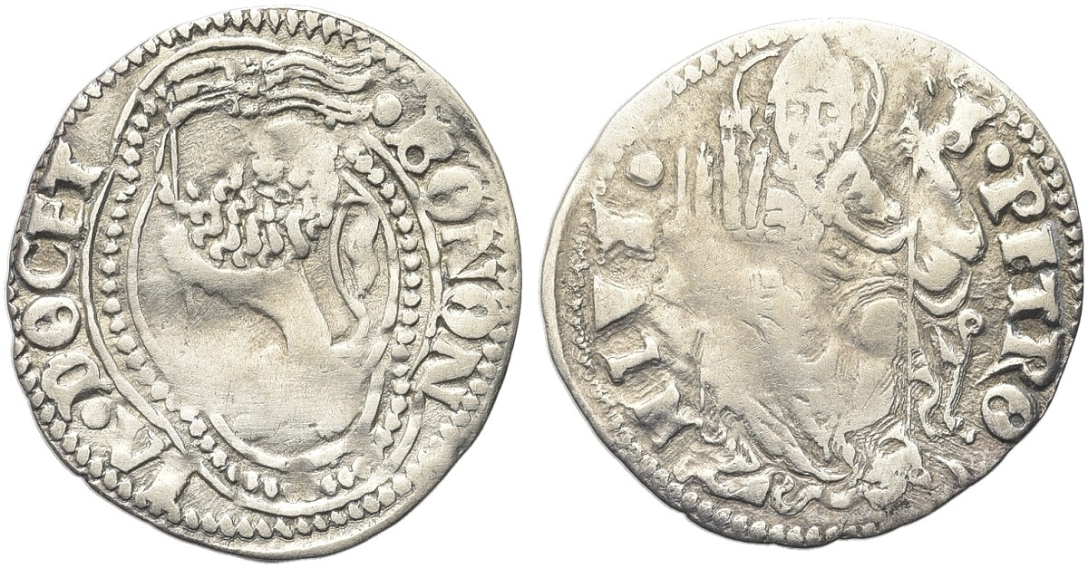 Dr. BONON - IA DOCET. Leone vessillifero rampante verso s. Rv. S PETRO - NIVS. San Petronio, seduto e frontale, regge pastorale e modellino della città.