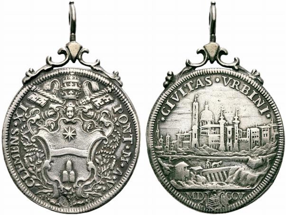 Dr. CLEMENS XI PONT M A V Stemma a targa con due rami d’olivo in basso, chiavi con impugnatura a cuore. Rv. CIVITAS VRBINI Veduta di Urbino.
