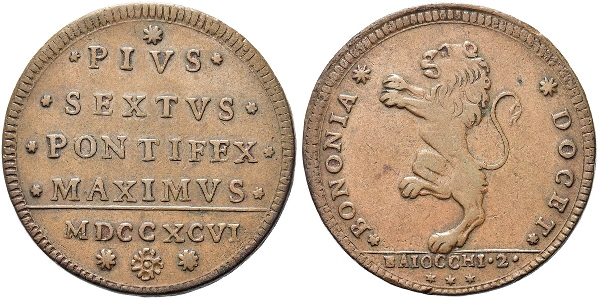 Dr. PIVS / SEXTVS / PONTIFEX / MAXIMVS. Iscrizione disposta su quattro righe; in esergo, MDCCXCVI. Rv. BONONIA - DOCET. Leone rampante verso s.; in esergo, valore.