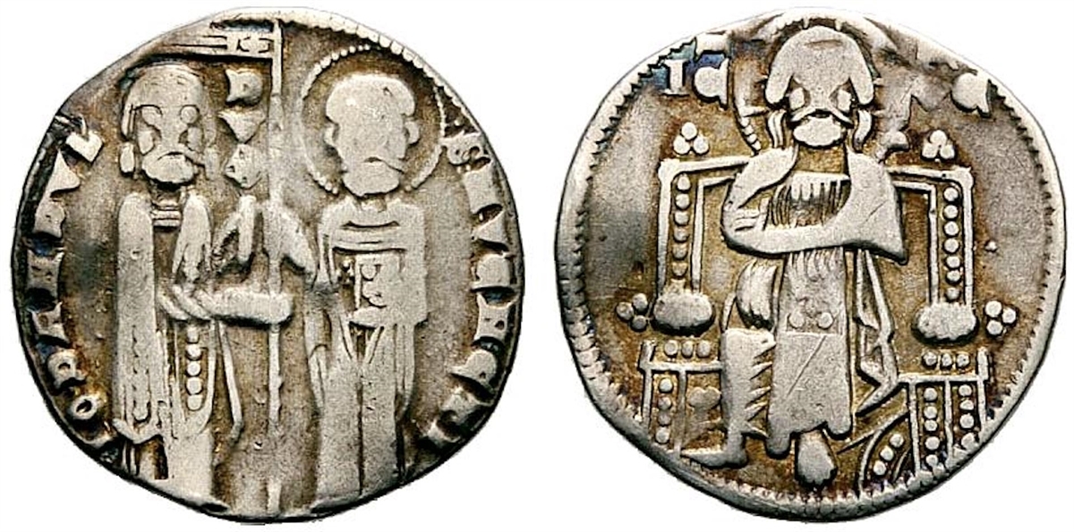 Dr. IO DANDVL DVX SM VENETI S. Marco consegna il vessillo al doge, entrambi stanti di fronte. Rv. Il Redentore seduto in trono, ai lati IC XC (Monogramma di Gesù Cristo).