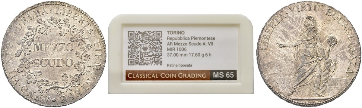 Dr. ANNO VII REP I DELLA LIBERTA’ PIEMONTESE. MEZZO / SCUDO Iscrizione su due righe, entro serto di rami di quercia. Rv. LIBERTA’ VIRTU’ EGUAGLIANZA. Nel campo allegoria del Piemonte stante al centro in abiti classici che sostiene con la s. fascio con scure e pileo; sullo sfondo, il Monviso.