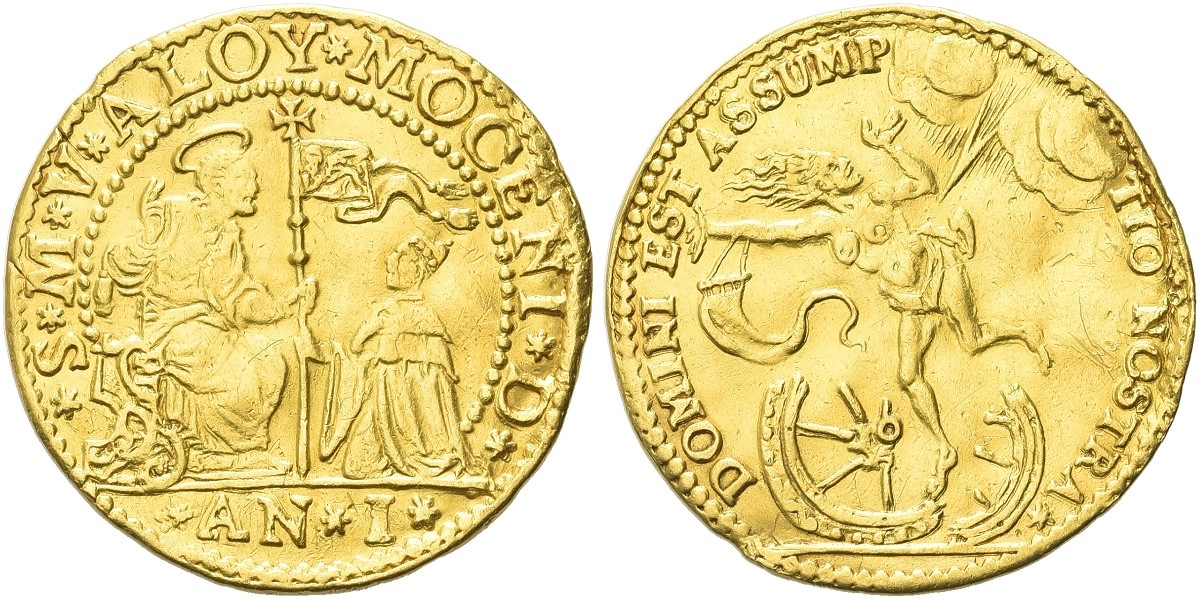 Dr. S M V ALOY MOCENI D / AN I. San Marco, seduto verso d., consegna il vessillo al Doge, genuflesso. Rv. DOMINI EST ASSVMP - TIO NOSTRA. Figura muliebre (la Fortuna), velata solo nei lombi, colpita da un fulmine protende le braccia per ripararsi nella caduta; ai suoi piedi, una ruota in frantumi.