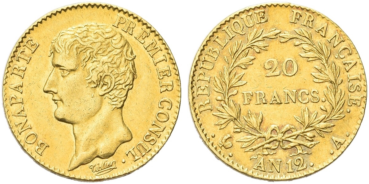 Napoleone Bonaparte, primo Console, 1799-1804. 20 Franchi an. 12 (1803-1804) A, zecca di Parigi.